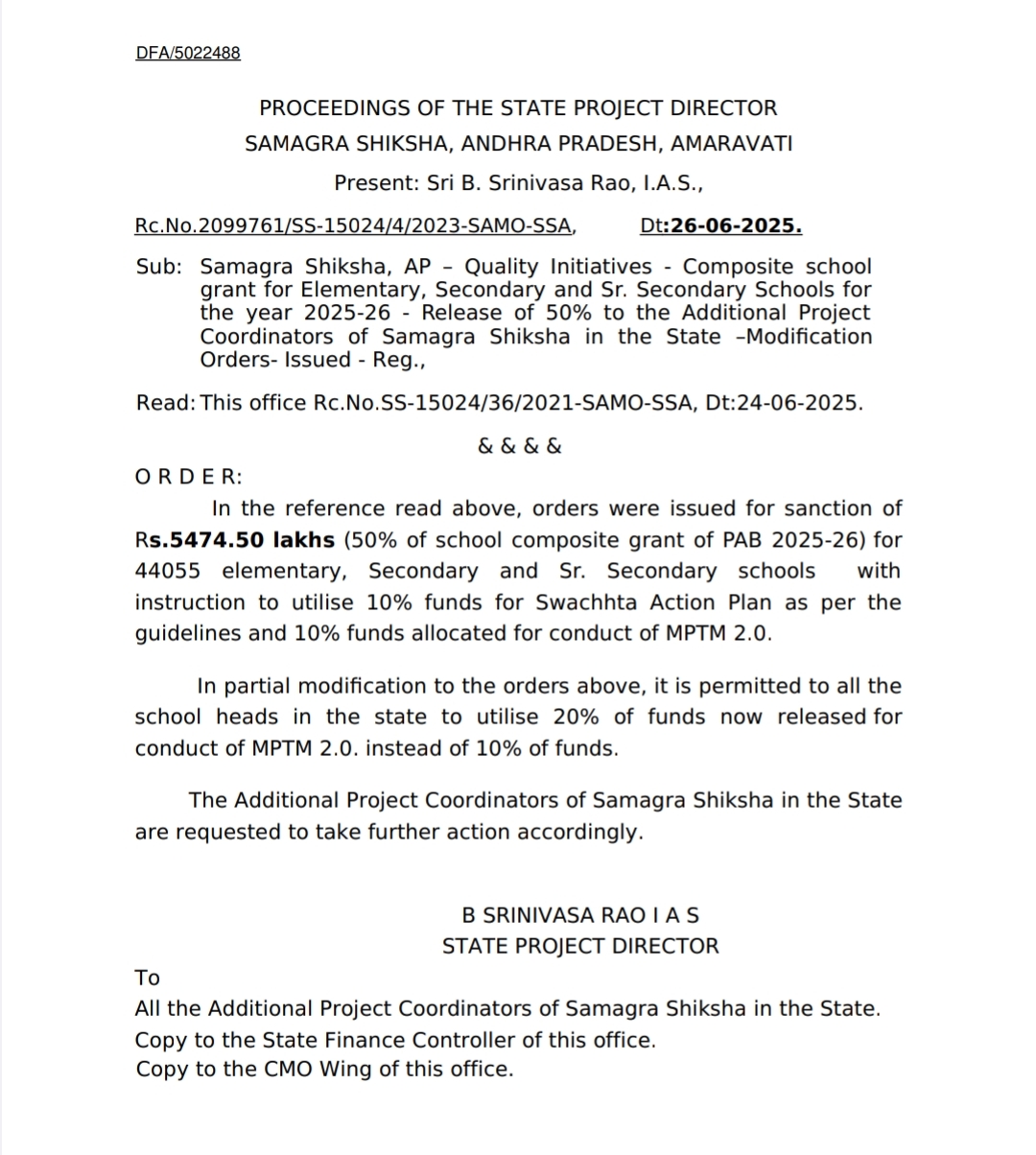 Samagra Shiksha, AP – Quality Initiatives Composite school grant for Elementary, Secondary and Sr. Secondary Schools for the year 2025-26 Release of 50% to the Additional Project Coordinators of Samagra Shiksha in the State Modification Orders- Issued – Reg.,